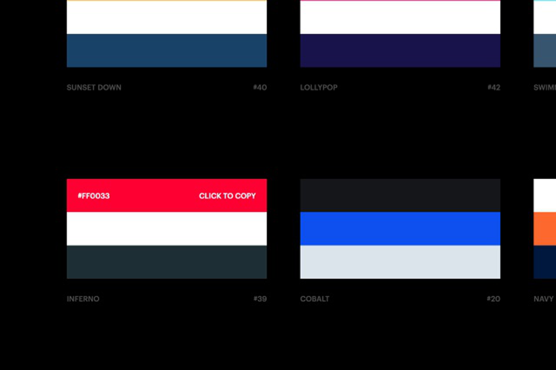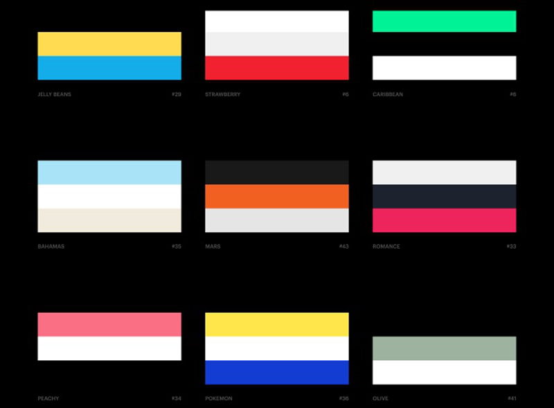 開(kāi)啟 Colorinspire.io 網(wǎng)站后可以看到各個(gè)顏色組合,目前約有45 種,每一個(gè)組合都由三種顏色構(gòu)成,下方還會(huì)有配色名稱和編號(hào)。