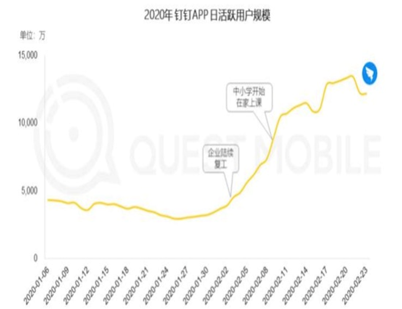 Trustdata 數(shù)據(jù)顯示:2020 年1月1日至2月21日,釘釘日活躍用戶從 2610萬升至1.5億,無疑成為這次疫情中單個產(chǎn)品增長最讓人印象深刻的產(chǎn)品。
