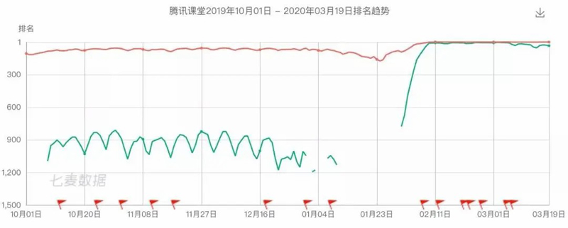 此外,疫情期間,騰訊還有一匹黑馬——騰訊課堂,這個推出多年的APP在AppStore之前一直徘徊在1000名左右,疫情爆發(fā)后迅速躥高,最高到達了第5名的高位。